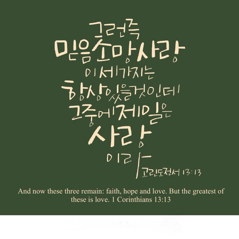 "그런즉 믿음, 소망, 사랑, 이 세 가지는 항상 있을 것인데 그 중의 제일은 사랑이라"