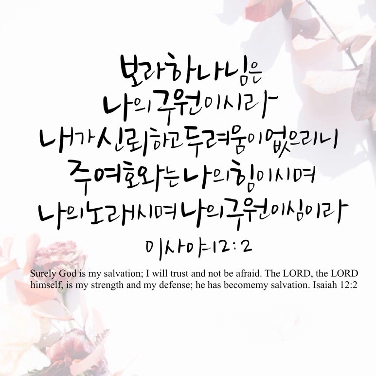 "보라 하나님은 나의 구원이시라 내가 신뢰하고 두려움이 없으리니 주 여호와는 나의 힘이시며 나의 노래시며 나의 구원이심이라."