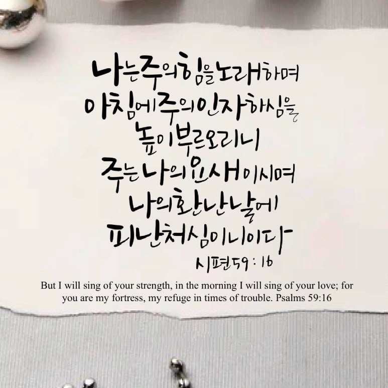 "나는 주의 힘을 노래하며 아침에 주의 인자하심을 높이 부르오리니 주는 나의 요새이시며 나의 환난 날에 피난처심이니이다"