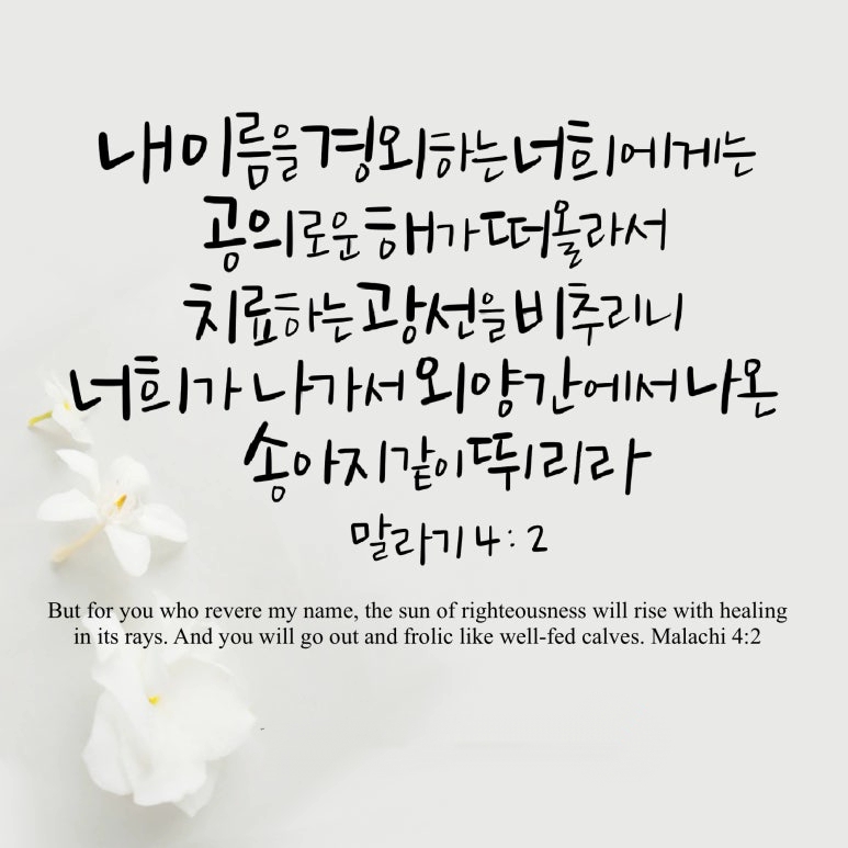 “내 이름을 경외하는 너희에게는 공의로운 해가 떠올라서 치료하는 광선을 비추리니 너희가 나가서 외양간에서 나온 송아지 같이 뛰리라.”