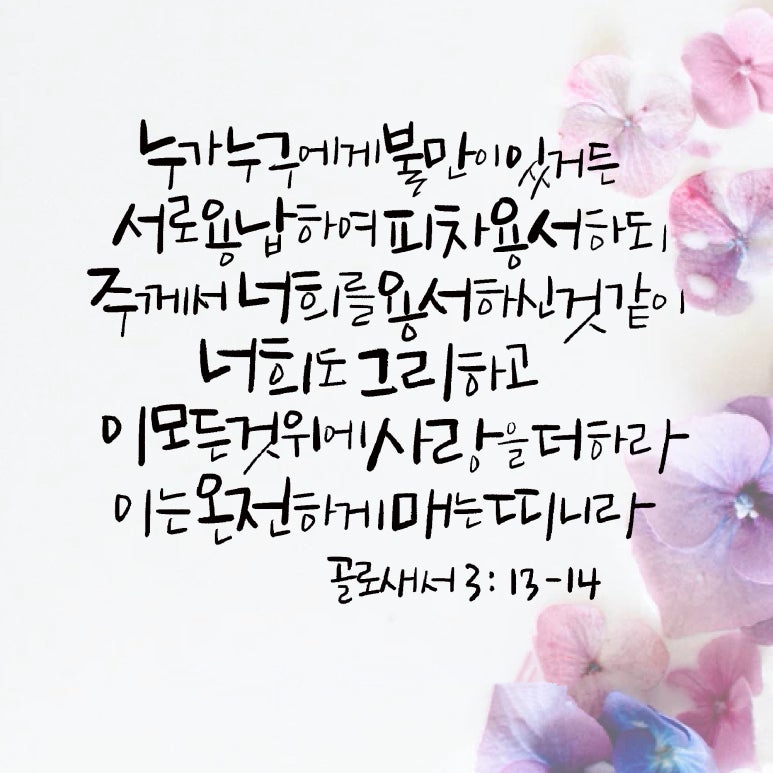 "누가 누구에게 불만이 있거든 서로 용납하여 피차 용서하되 주께서 너희를 용서하신 것 같이 너희도 그리하고 이 모든 것 위에 사랑을 더하라 이는 온전하게 매는 띠니라"