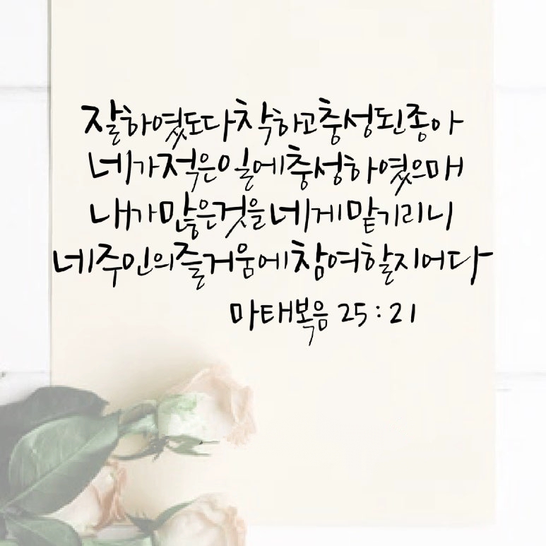 “그 주인이 이르되 잘하였도다 착하고 충성된 종아 네가 적은 일에 충성하였으매 내가 많은 것을 네게 맡기리니 네 주인의 즐거움에 참여할지어다 하고”