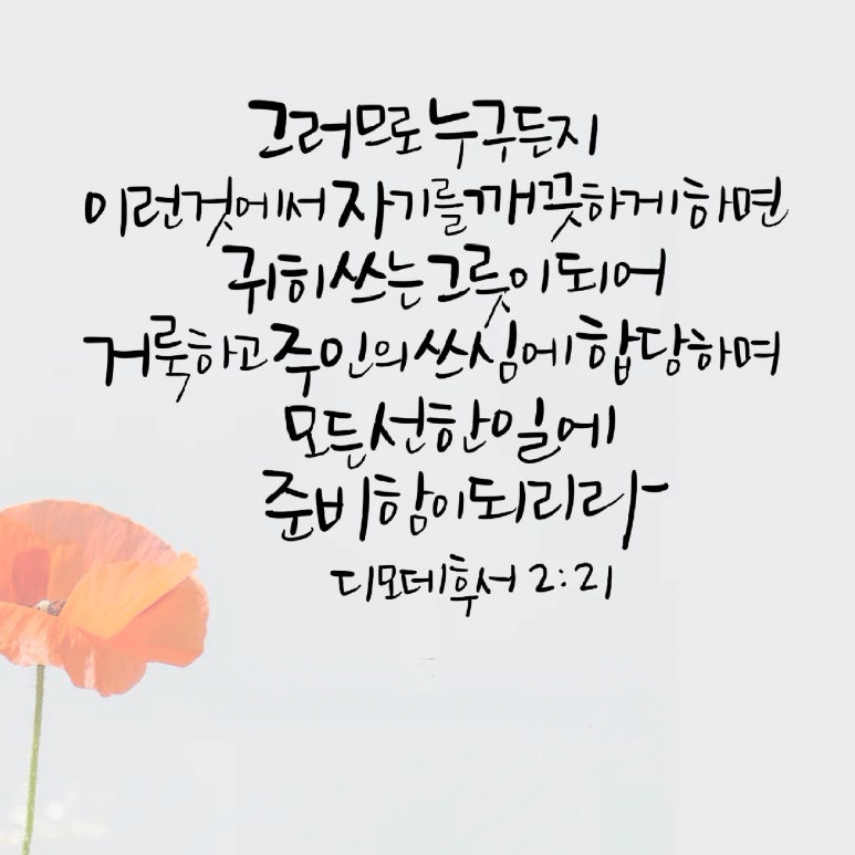 "그러므로 누구든지 이런 것에서 자기를 깨끗하게 하면 귀히 쓰는 그릇이 되어 거룩하고 주인의 쓰심에 합당하며 모든 선한 일에 준비함이 되리라"