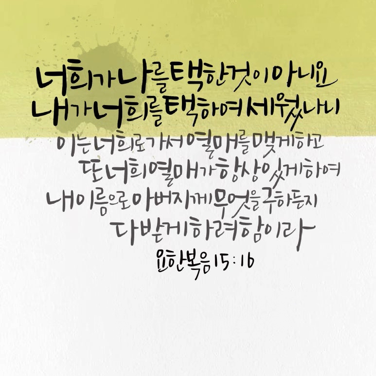 "너희가 나를 택한 것이 아니요 내가 너희를 택하여 세웠나니 이는 너희로 가서 열매를 맺게 하고 또 너희 열매가 항상 있게 하여 너희가 내 이름으로 아버지께 구하는 것을 다 받게 하려 함이라"