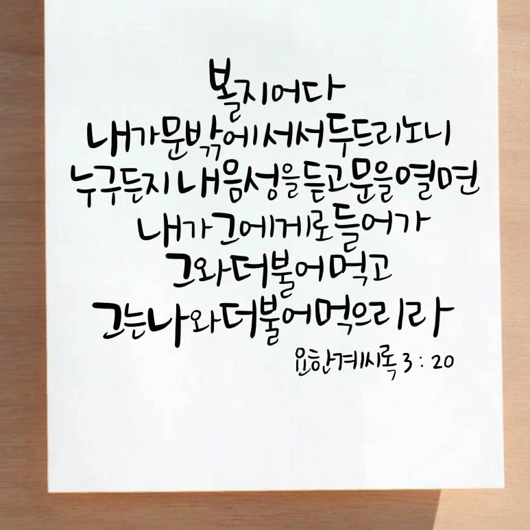 "볼지어다 내가 문 밖에 서서 두드리노니 누구든지 내 음성을 듣고 문을 열면 내가 그에게로 들어가 그와 더불어 먹고 그는 나와 더불어 먹으리라"