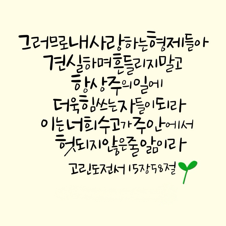 "그러므로 내 사랑하는 형제들아 견고하며 흔들리지 말고 항상 주의 일에 더욱 힘쓰는 자들이 되라 이는 너희 수고가 주 안에서 헛되지 않은 줄 앎이라"
