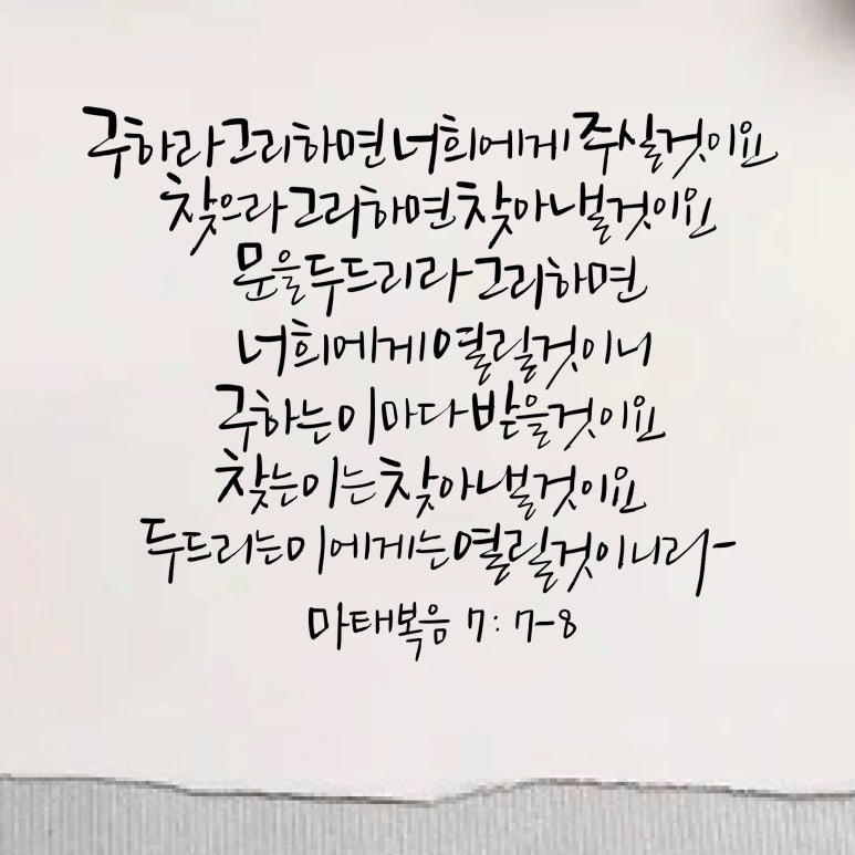 “구하라 그리하면 너희에게 주실 것이요 찾으라 그리하면 찾아낼 것이요 문을 두드리라 그리하면 너희에게 열릴 것이니 구하는 이마다 받을 것이요 찾는 이는 찾아낼 것이요 두드리는 이에게는 열릴 것이니라.”